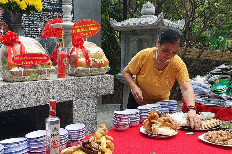 Bà Nguyễn Thị Hường, chị liệt sĩ Nguyễn Tất Nam, chăm chút lễ cúng các liệt sĩ.