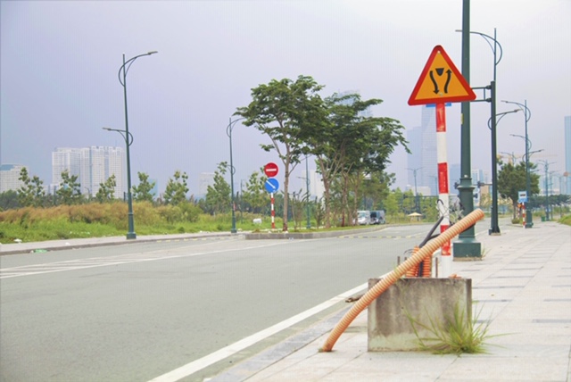 Một số đoạn tuyến đường R2 có những nắp cống để ngổn ngang, phần vỉa hè vẫn chưa được thi công hoàn thiện và trụ đèn vẫn còn hở điện nguy hiểm.