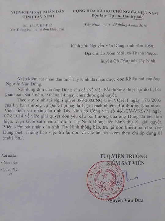 Ngày 25.5.1983, ông Dũng trở lại đơn vị để trình báo sự việc đồng thời xin được phục hồi chế độ như nhưng quân nhân khác. Tuy nhiên, đơn vị từ chối giải quyết với lý do không biết ông bị bắt oan nên đã cắt quân số, thông báo về địa phương là ông đào ngũ. Đồng thời người ở đơn vị cấp giấy, hướng dẫn ông khiếu nại ở Viện KSND tỉnh Tây Ninh. Nhưng khi đó chưa có Luật Trách nhiệm bồi thường của nhà nước nên cơ quan này không giải quyết.