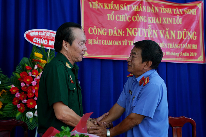 Ngày 8.5, ông Nguyễn Văn Dũng, một trong 8 nạn nhân oan sai trong vụ án “cướp 5 chỉ vàng” xảy ra ở ấp Bùng Binh, xã Đôn Thuận, H.Trảng Bàng (Tây Ninh) cách đây 40 năm đã được Viện KSND tỉnh Tây Ninh trực tiếp xin lỗi, phục hồi danh dự.