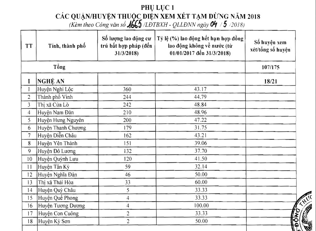 Theo thống kê của Bộ LĐ-TB&XH, cả nước có 107 quận, huyện có tỷ lệ lao động hết hạn hợp đồng không về nước trên 30% thuộc 12 tỉnh, thành phố trực thuộc trung ương có số lao động cư trú bất hợp pháp cao nhất tại Hàn Quốc, thuộc diện đưa vào xem xét tạm dừng tuyển chọn trong năm 2018.