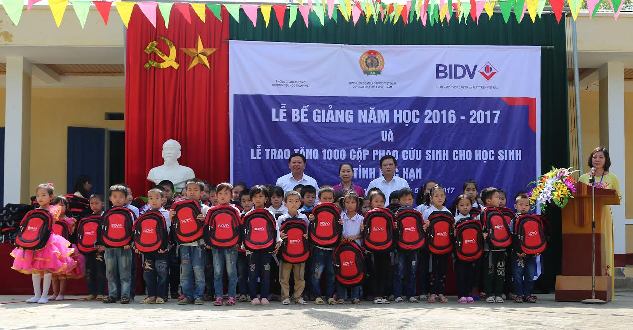 HOANHAP.VN - Trong 2 ngày 25 và 26/5/2017, Ngân hàng TMCP Đầu tư và Phát triển Việt Nam (BIDV) phối hợp với Quỹ Bảo trợ trẻ em Công đoàn Việt Nam tặng 2.000 cặp phao cứu sinh và 40 triệu đồng cho các em học sinh tại các trường mầm non, tiểu học thuộc xã Đoài Côn huyện Trùng Khánh, tỉnh Cao Bằng và trường tiểu học Thanh Vận thuộc xã Thanh Vận, huyện Chợ Mới, tỉnh Bắc Kạn.