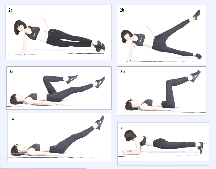 Nằm nghiêng trên thảm, tay phải chống ngay dưới vai. Hai chân duỗi thẳng giữ toàn bộ thân người thẳng hàng. Tay trái giữ nhẹ vào hông. Hít vào nhấc cao chân trái hết mức có thể. Chân trái duỗi thẳng. Thở ra, trở về tư thế ban đầu. Lặp lại động tác 15 lần. Cần cố định hông khi thực hiện động tác.