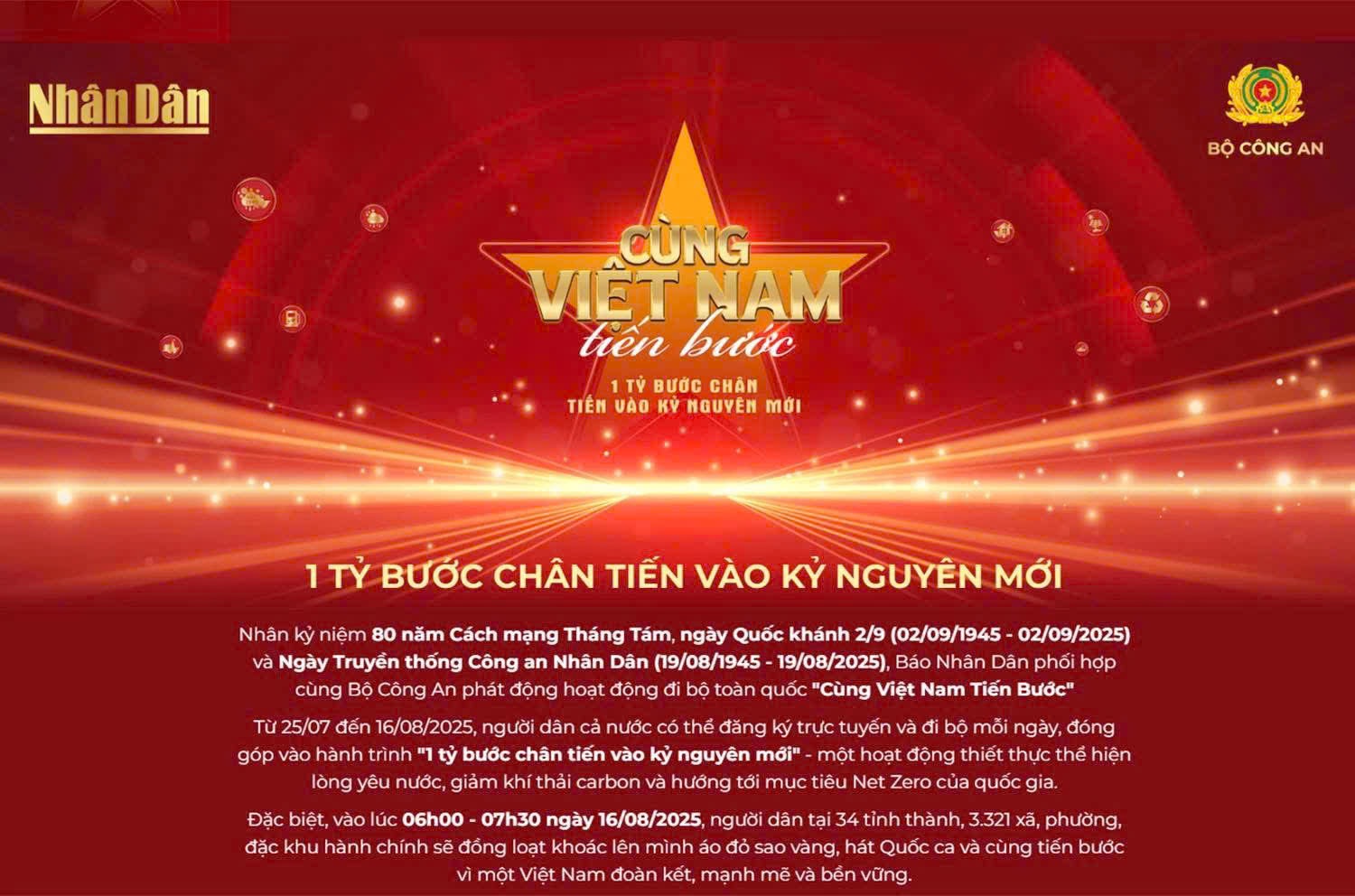 Hướng tới kỷ niệm 80 năm Cách mạng Tháng Tám (19/8/1945 – 19/8/2025), Quốc khánh 2/9 (1945 – 2025) và Ngày truyền thống Công an nhân dân, chương trình đi bộ toàn quốc “Cùng Việt Nam tiến bước” do Báo Nhân Dân phối hợp Bộ Công an tổ chức đã được triển khai đồng loạt tại 34 tỉnh, thành phố, 3.321 xã, phường, đặc khu hành chính trên cả nước.