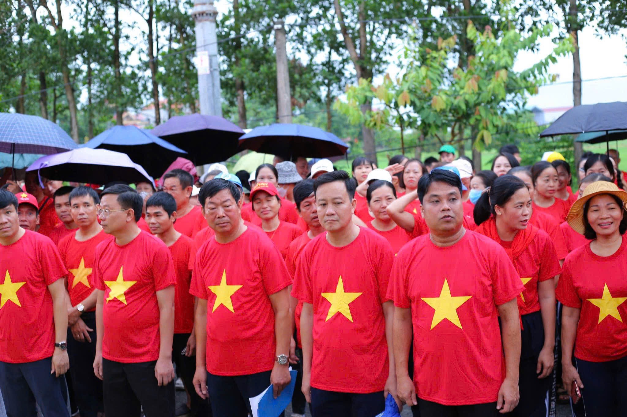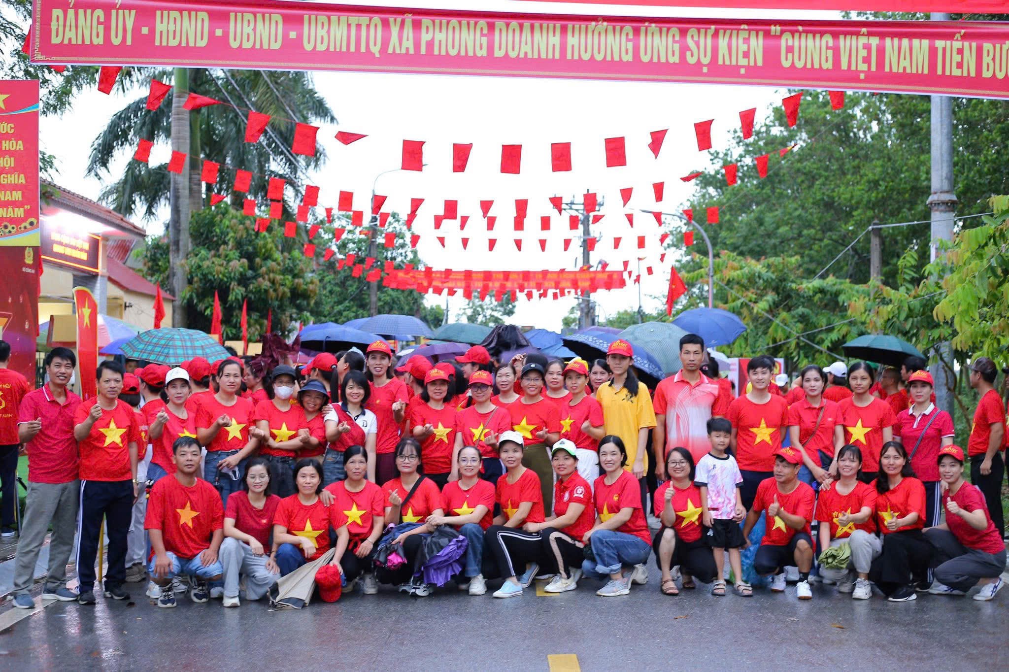 Tại Phong Doanh, từ 6 giờ sáng, hàng trăm người dân và cán bộ đã tập trung dưới những lá cờ đỏ tung bay, hòa chung nhịp đập của trái tim yêu nước. Mặc cho mưa rơi, tinh thần vẫn rực lửa: áo đỏ, sao vàng, tiếng hô vang và bước chân kiên định.