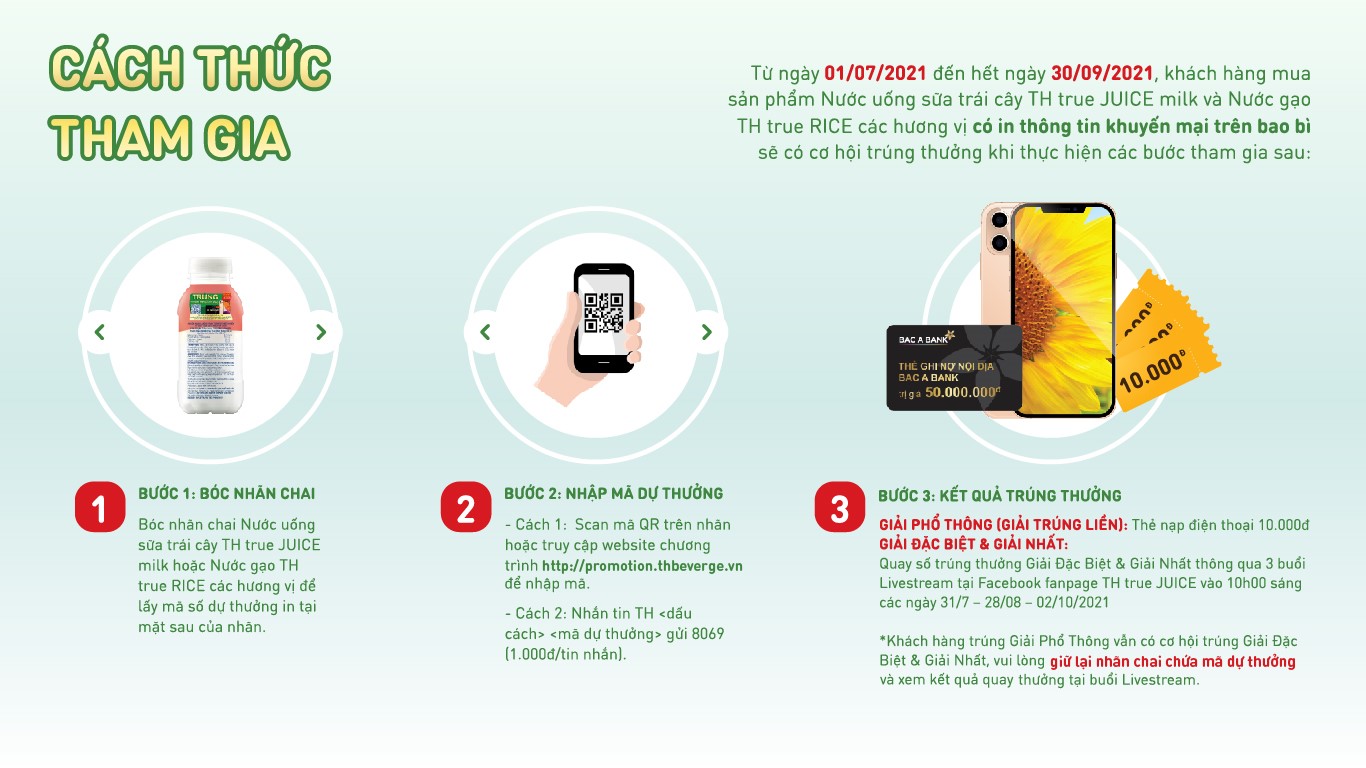 Bước 3: Giữ lại nhãn chai có chứa mã dự thưởng và xem Livestream Quay số trúng thưởng tại Facebook fanpage TH true JUICE (https://www.facebook.com/thtruejuice) vào 10h sáng các ngày 31/07/2021 – 28/08/2021 – 02/10/2021 để có cơ hội trúng các Giải Đặc Biệt và Giải Nhất.