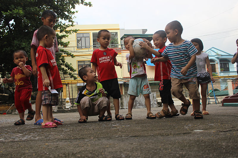 Về “nhà chung” - là lúc các em hồn nhiên nhất. Bé thì chơi xích đu, cầu trượt. Một số bé tách chơi đá bóng cùng các bạn khác trong trung tâm.