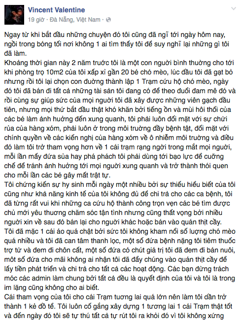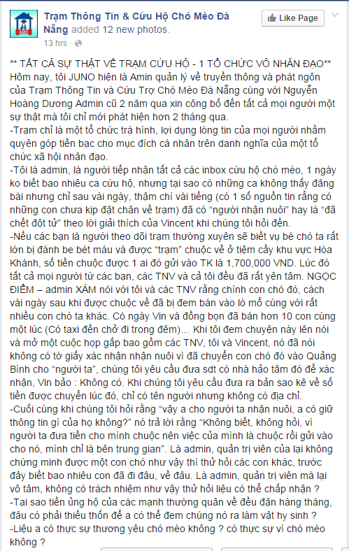 | Thông tin được đăng trên thông tin chính thức của Trạm thông tin cứu hộ chó mèo Đà Nẵng vào tối 14/4 đã gây rung động mạng xã hội. |