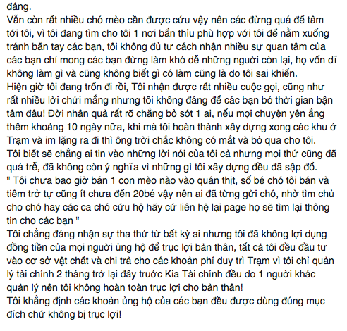 Theo đó, người bị tố cáo đã có hành động buôn bán chó mèo cho các lò mổ, thẳng tay đánh đập động vật khi chúng làm ồn, làm cho chó, mèo bị thương rồi chụp hình đăng lên Facebook kèm theo một câu chuyện đáng thương để xin tiền từ thiện, dùng tiền quyên góp của những người yêu động vật vào mục đích riêng… là V.V - người chuyên làm công tác tiếp nhận, chăm sóc, tìm chủ mới cho những chú chó, mèo tại Trạm cứu hộ.