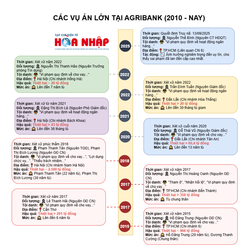 Tiếp nối chuỗi sai phạm là vụ án tại Agribank Chi nhánh 6, gây thiệt hại hơn 966 tỷ đồng. Vụ việc này phơi bày sự câu kết tinh vi giữa doanh nghiệp và cán bộ ngân hàng biến chất, khi cựu Giám đốc Hồ Đăng Trung (lĩnh án 20 năm tù) đã làm ngơ để "siêu lừa" Dương Thanh Cường dùng thủ đoạn mượn lại tài sản đã thế chấp để tiếp tục đi lừa đảo. Cùng lúc đó, ở phía Nam, vụ án tại Agribank Bến Thành với thiệt hại hơn 358 tỷ đồng cho thấy sự lộng quyền đến cực điểm của cựu Giám đốc Nguyễn Thị Hoàng Oanh (lĩnh án chung thân), người đã biến chi nhánh thành "sân sau" để tham ô, nhận hối lộ và sẵn sàng trù dập cấp dưới để che giấu tội ác. Những con số hàng nghìn tỷ đồng không chỉ là tiền, mà là minh chứng cho một hệ thống quản trị nhân sự đã thất bại trong việc lựa chọn, giám sát và ngăn chặn hành vi phạm tội của chính những người mà nó đặt vào vị trí quyền lực.