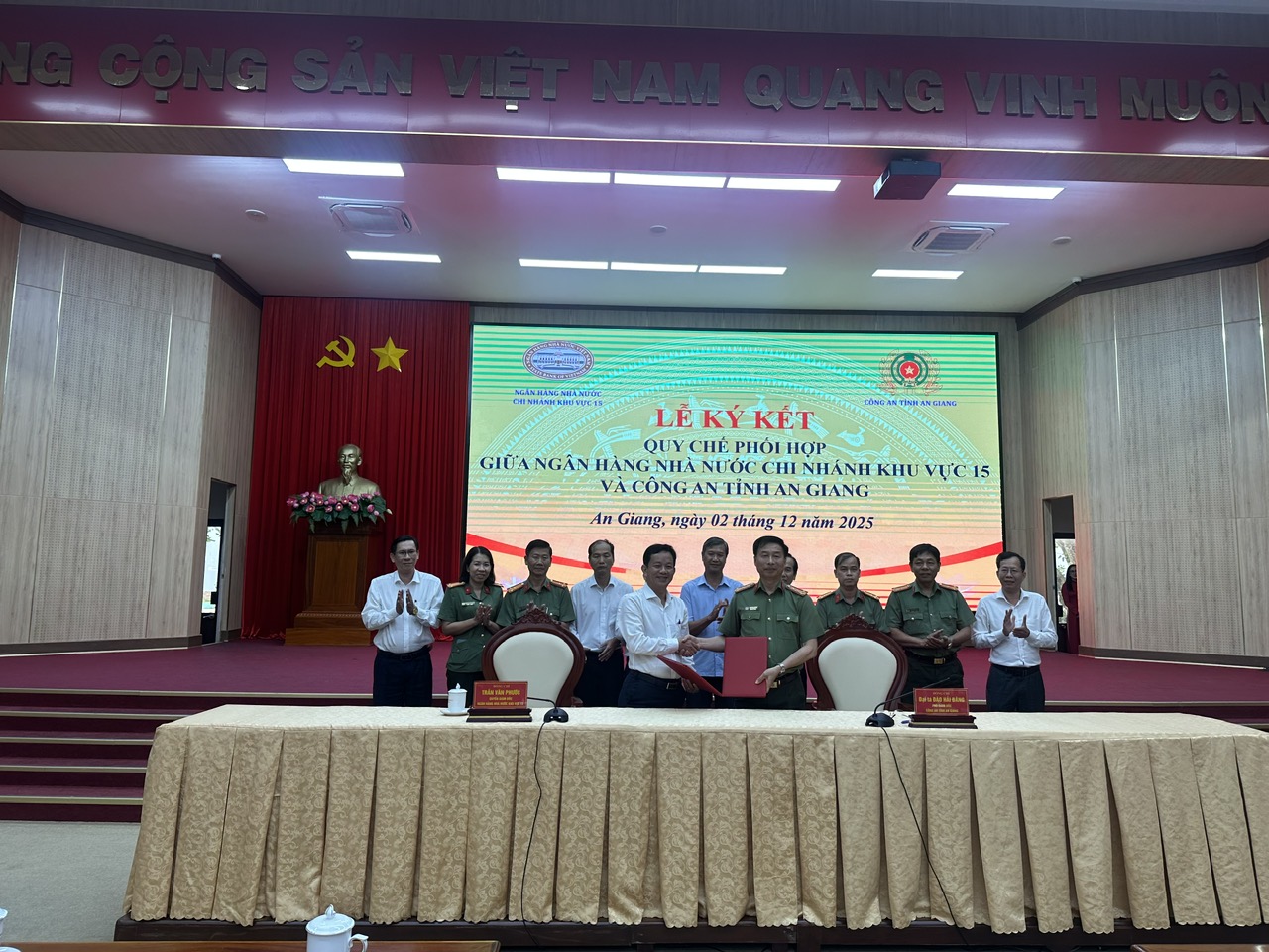 Lễ ký kết Quy chế phối hợp giữa Ngân hàng Nhà nước Khu vực 15 và Công an tỉnh An Giang. Ảnh Trọng Triết