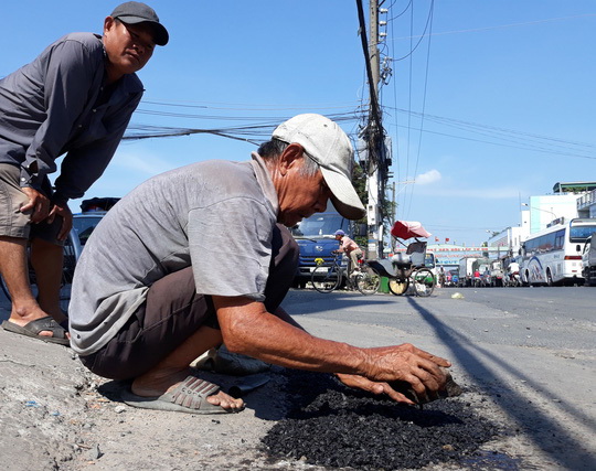 Ông Cao Văn Long, ngụ khóm Đông An 4, phường Mỹ Xuyên, TP Long Xuyên, tỉnh An Giang hàng ngày đi nhặt các mảnh nhựa đường từ các công trình giao thông loại ra, mang về tách lấy phần đá to. Phần nhựa đường và đá nhỏ được ông dùng dầu lửa rải vào và ủ qua đêm để tạo kết dính. Khi dặm vá “ổ voi”, “ổ gà”, ông vệ sinh mặt đường rồi phết dầu, đổ đá và cho phần nhựa đường băm nát xuống, sau đó dùng đá nện mạnh cho bằng và tận dụng các phương tiện lưu thông trên đường giúp bề mặt chỗ được dặm vá thêm kết dính, nén chặt.