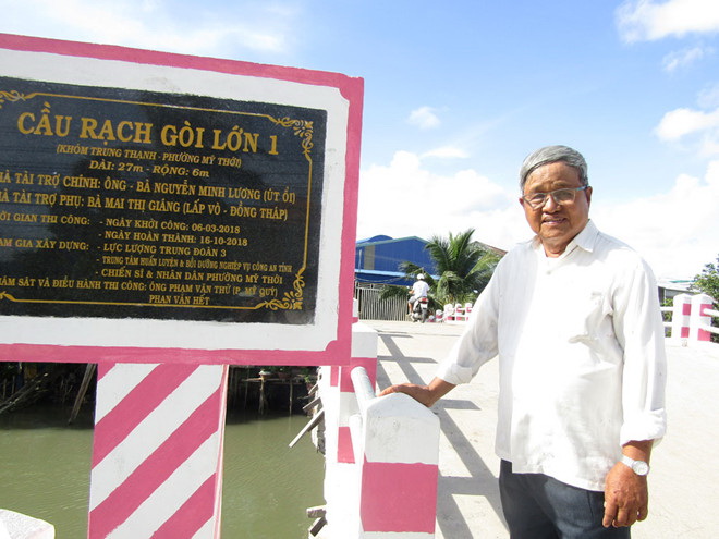 Còn ông Nguyễn Minh Lương (tên thường gọi là Út Ổi), 71 tuổi, ngụ phường Mỹ Quý, TP.Long Xuyên, An Giang, hơn 10 năm qua bỏ ra hơn 8 tỉ đồng để xây nhiều cầu kiên cố ở địa phương; dành hàng tỉ đồng giúp người nghèo và hiến đất xây trường học...