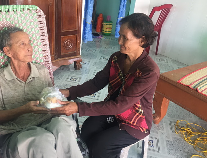 Riêng đối với bà bà Nguyễn Thị Lệ Dung (64 tuổi, ngụ ấp Đông Sơn 1, thị trấn Núi Sập, huyện Thoại Sơn, An Giang dù trời nắng cũng như mưa, bà đều mang cơm chay trao tận tay các cụ già neo đơn, người bệnh tật đi đứng khó khăn.
