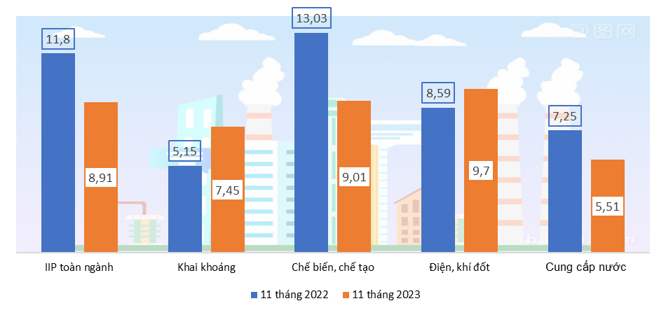Chỉ số tồn kho toàn ngành công nghiệp chế biến, chế tạo dự tính tháng 11/2023 tăng 4,74% so tháng trước, nhưng giảm 17,74% so cùng kỳ. Chỉ số tiêu thụ toàn ngành công nghiệp chế biến, chế tạo dự tính tháng 11/2023 giảm 6,93% so tháng trước và tăng 2,76% so cùng kỳ; tính chung 11 tháng năm 2023 giảm 8,18% so cùng kỳ. Chỉ số sử dụng lao động của doanh nghiệp công nghiệp tăng 1,32% so tháng trước và tăng 6,10% so cùng kỳ; tính chung 11 tháng năm 2023 giảm 3,77% so cùng kỳ.