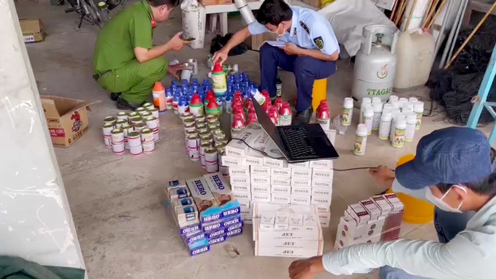 Qua kiểm tra, Tổ công tác phát hiện tại khu vực kho chứa hàng hoá có cất giấu 196 chai, hộp thuốc trừ bệnh, thuốc diệt chuột xuất xứ nước ngoài (trên bao bì có ghi sản phẩm chứa hoạt chất 2.4D; glyphosate và hoạt chất Zinc phosphide thuộc danh mục cấm sử dụng tại Việt Nam), 200 chai thuốc trừ bệnh không rõ nguồn gốc xuất xứ. Ngoài ra còn phát hiện thu giữ 640 bao thuốc lá ngoại nhập lậu các loại cùng nhiều tang vật có liên quan đến việc buôn bán hàng cấm được cất giấu tại nhiều nơi trong cửa hàng.