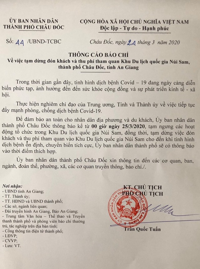 Văn bản thông báo tạm ngưng đón khách và thu phí tham quan tại Khu du lịch quốc gia Núi Sam của UBND TP. Châu Đốc, tỉnh An Giang.