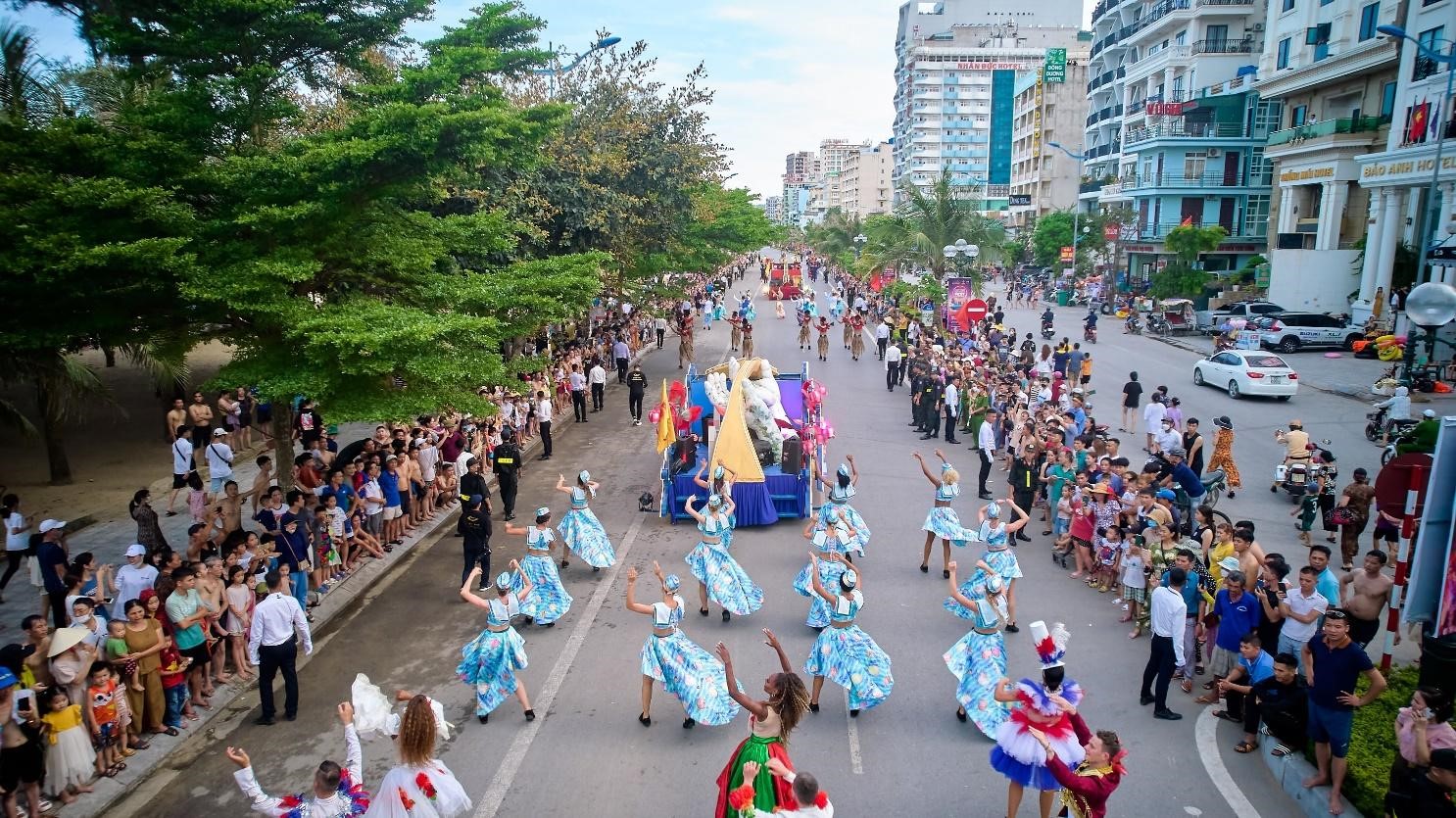 Từ khu vực xuất phát là quảng trường Sầm Sơn, những vũ công cùng các xe hoa mang phối cảnh những biểu tượng du lịch của Thanh Hóa và của các vùng đất mà Sun Group đã đặt chân đến như trống đồng Đông Sơn, thành nhà Hồ, Cầu Vàng… đã khuấy động không khí khắp dọc tuyến đường đến địa điểm sân khấu thứ hai tại ngã 3 Lê Thánh Tông.