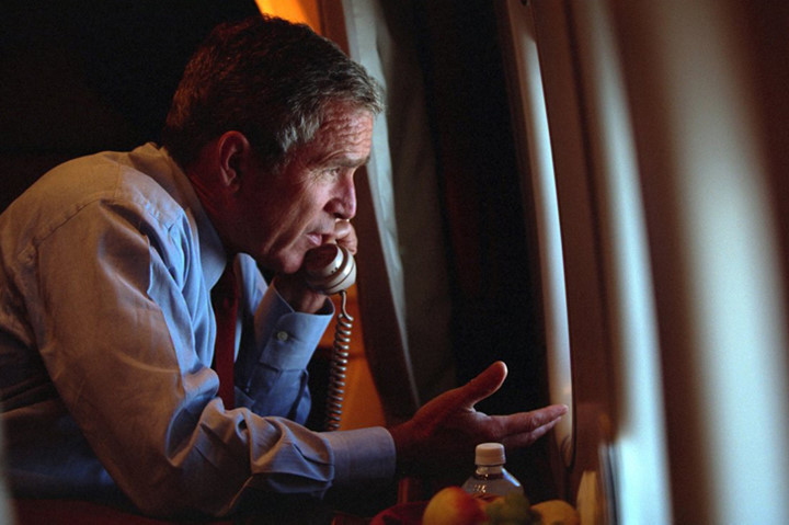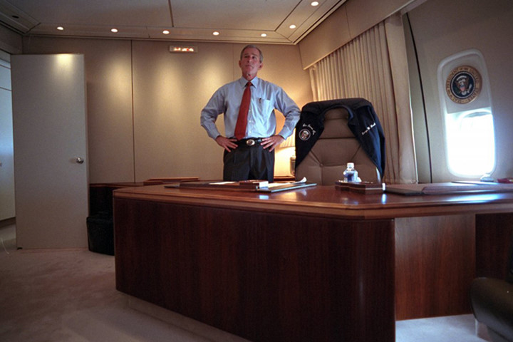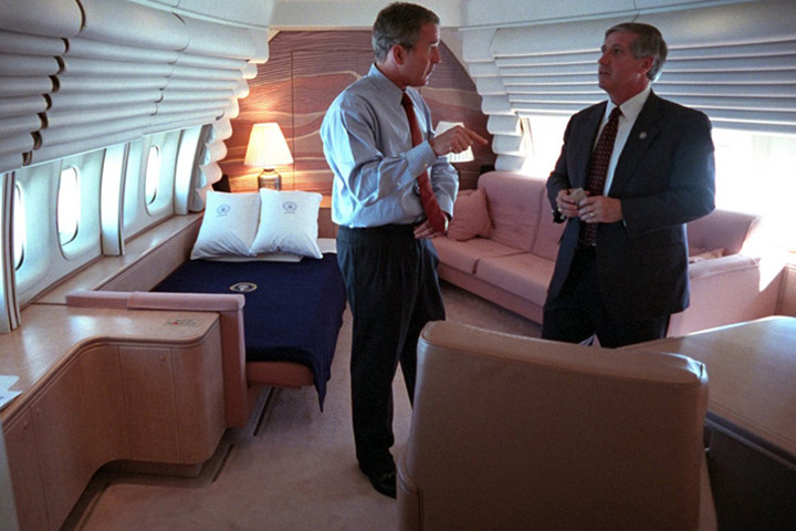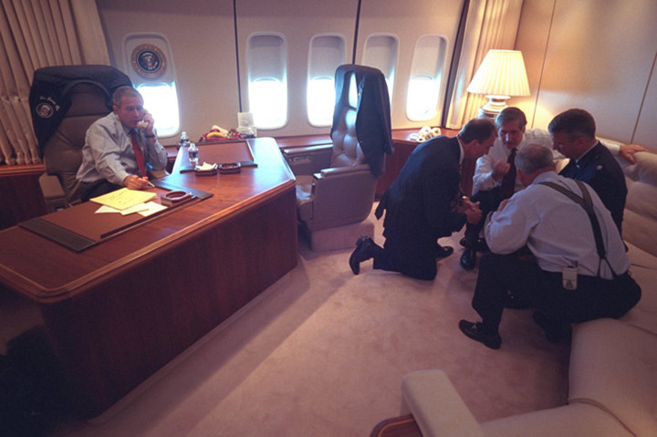 | Từ văn phòng trên chiếc chuyên cơ Air Force One, ông Bush lấy ý kiến của cấp dưới qua điện thoại, trong lúc bay từ Sarasota tới căn cứ không quân Barksdale. |