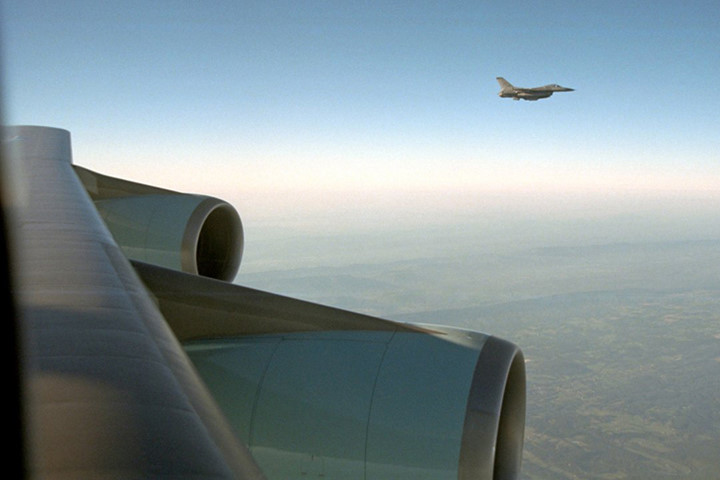 | Chiến đấu cơ F-16 hộ tống chuyên cơ của Tổng thống Mỹ. |