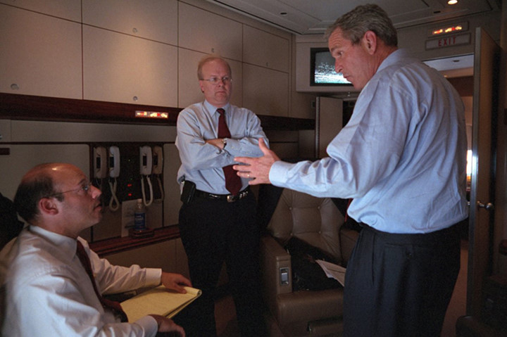 | Lãnh đạo Mỹ Bush nói chuyện với các vị Ari Fleischer (trái) và Karl Rove trong lúc bay tới căn cứ không quân Andrews. |