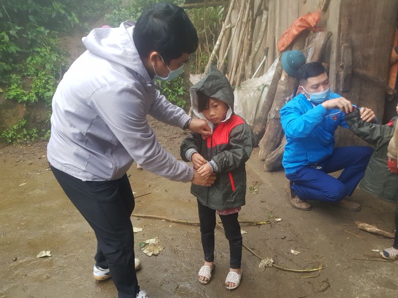 Các anh chị thành viên, tình nguyện viên của CLB Hành trình Nhiệt huyết mặc áo khoác mới cho các em nhỏ.