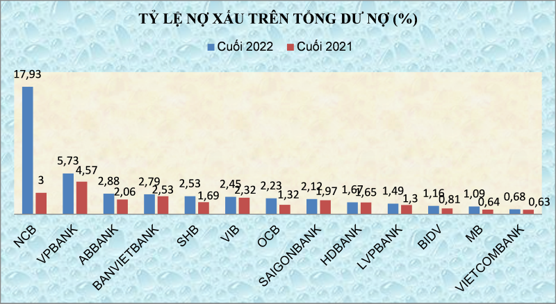 NHNN cho biết, tại thời điểm cuối năm 2022, tỉ lệ nợ xấu nội bảng toàn ngành ngân hàng ở mức 1,92%. Nhưng theo số liệu từ báo cáo tài chính quý 4/2022 của 27 ngân hàng niêm yết, dư nợ xấu tại thời điểm cuối năm 2022 đã tăng đến 35% so với hồi đầu năm, lên trên 136.400 tỉ đồng. Trong đó, có ngân hàng có tỉ lệ nợ xấu (nợ nhóm 3, 4, 5) trên tổng dư nợ cao nhất là 17,93%, với khối lượng nợ xấu tăng từ 1.249 tỉ đồng lên tới 8.556 tỉ đồng.