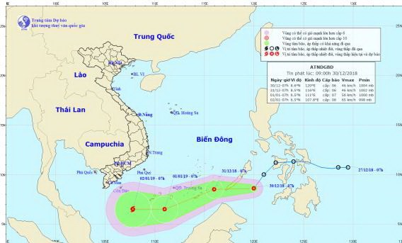 Dự báo, áp thấp nhiệt đới di chuyển theo hướng Tây Tây Nam, mỗi giờ đi được khoảng 25km và đi vào Biển Đông trong sáng 30/12. Vị trí tâm áp thấp nhiệt đới ở khoảng 10,3 độ Vĩ Bắc; 114,9 độ Kinh Đông, cách đảo Trường Sa (quần đảo Trường Sa) khoảng 350km về phía Đông Đông Bắc. Sức gió mạnh nhất vùng gần tâm áp thấp nhiệt đới mạnh cấp 6-7 (40-60km/giờ), giật cấp 9.