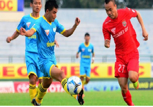 B.Bình Dương (áo đỏ) đang có phong độ cao. (Ảnh: Bích Thùy).