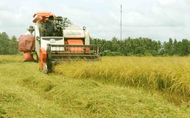 | Người dân TP.Cần Thơ thu hoạch lúa bằng máy gặt đập liên hợp |
