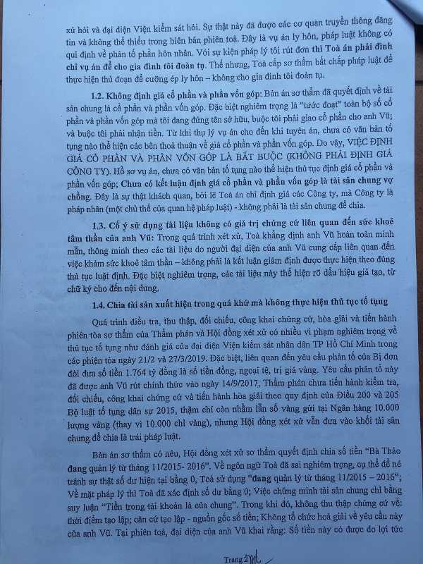 - HĐXX quyết định chia số tiền bà Thảo đang quản lý từ tháng 11/2015- 2016, để né tránh sự thật số dư hiện tại bằng 0. Việc chứng minh tài sản chung chỉ bằng suy luận “Tiền có trong tài khoản là của chung”, trong khi đó, không thu thập chứng cứ về thời điểm tạo lập, căn cứ tạo lập, nguồn gốc số tiền, không tổ chức hòa giải về yêu cầu này của ông Vũ. Tại phiên tòa, đại diện của ông Vũ khai rằng số tiền này có được do lợi tức trong kinh doanh. Bà Thảo đề nghị HĐXX yêu cầu các Công ty Trung Nguyên cung cấp tài liệu xác định vợ chồng bà Thảo được chia cổ tức là bao nhiêu tiền, vì các Công ty có sổ sách minh bạch nhưng HĐXX không thực hiện.