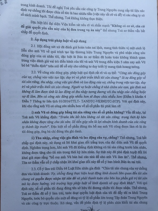 + Điều 64 Luật Hôn nhân và gia đình quy định chia tài sản chung của vợ chồng đưa vào kinh doanh: Vợ, chồng đang thực hiện hoạt động kinh doanh liên quan đến tài sản chung có quyền được nhận tài sản đó và phải thanh toán cho bên kia phần giá trị tài sản mà họ được hưởng, trừ trường hợp pháp luật về kinh doanh có quy định khác. Như vậy, số cổ phần bà Thảo đang đứng tên sở hữu thì đương nhiên bà Thảo được nhận, thế nhưng HĐXX sơ thẩm đã tước đoạt quyền luật định của bà Thảo, đẩy bà Thảo ra khỏi Trung Nguyên, tước bỏ quyền của một cổ đông có tỷ lệ cổ phần lớn trong Tập đoàn Trung Nguyên và các Công ty trực thuộc...
