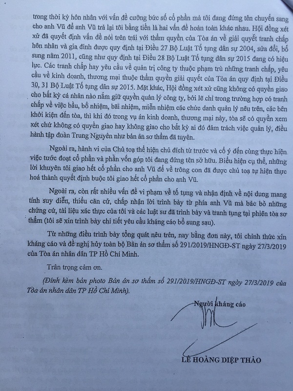 - HĐXX đánh giá hoàn toàn sai lệch, mang tính thiên vị cho ông Vũ về quá trình tạo lập thương hiệu Trung Nguyên và phủ nhận công sức đóng góp của bà Thảo. Đặc biệt, bản án sơ thẩm không khách quan trong việc đánh giá vai trò điều hành của bà Thảo, trong điều kiện 5 năm nay, ông Vũ thiền định trên núi, để cổ súy cho những tư duy triết lý mang tính hoang tưởng.