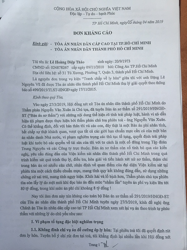 Không đồng ý với bản án sơ thẩm, bà Lê Hoàng Diệp Thảo đã có đơn kháng cáo toàn bộ bản án sơ thẩm số 291/2019/HNGĐ-ST ngày 27/3/2019 của TAND TP.Hồ Chí Minh, đề nghị TAND Cấp cao tại TP.Hồ Chí Minh xem xét lại vụ án theo trình tự phúc thẩm. Với những lý do chủ yếu như sau: