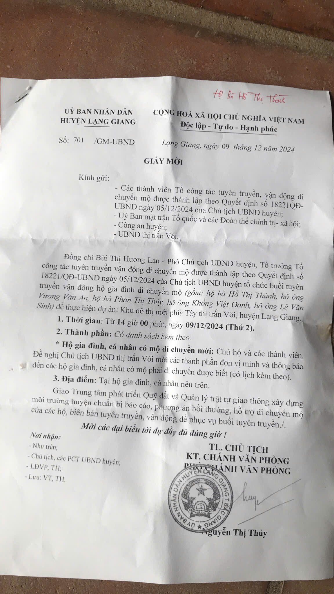 Ngày 9/12/2024, bà Bùi Thị Hương Lan – Phó Chủ tịch UBND huyện Lạng Giang, Tổ trưởng tổ công tác tuyên truyền vận động di chuyển mộ được thành lập theo Quyết định số 18221/QĐ-UBND ngày 05/12/2024 của Chủ tịch UBND huyện, tổ chức buổi tuyên truyền vận động hộ gia đình di chuyển mộ tại các hộ gia đình nằm trong danh sách tuyên truyền, vận động. Tuy nhiên, buổi họp kết thúc khi chưa có sự thống nhất ý kiến giữa UBND huyện Lạng Giang và các hộ gia đình.