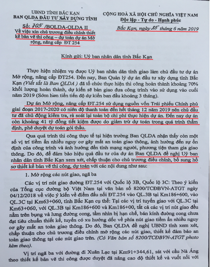 Có lẽ xuất phát từ sự “ấm ức” khi “phải tiết kiệm 10%” kể trên, nên ngày 25/6/2019 ông Mã Văn Thịnh- Giám đốc Ban QLDA Đầu tư xây dựng tỉnh Bắc Kạn- đã có văn bản gửi UBND tỉnh Bắc Kạn về việc xin chủ trương điều chỉnh thiết kế bản vẽ thi công- dự toán dự án Mở rộng, nâng cấp ĐT 254. Tại Văn bản này, Giám đốc Ban QLDA Đầu tư xây dựng tỉnh Bắc Kạn cho biết: “Dự án Mở rộng, nâng cấp ĐT 254 sử dụng nguồn vốn Trái phiếu Chính phủ giai đoạn 2017-2020 có niên độ thanh toán đến hết tháng 12 năm 2019 nên chủ đầu tư đã chủ động kiểm tra, rà soát lại toàn bộ chi phí thực hiện dự án. Đến nay dự án còn khoảng 41 tỷ đồng tiết kiệm được do giảm trừ dự toán trong quá trình thẩm định, phê duyệt dự toán gói thầu.”
