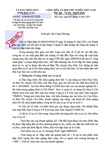 Cụ thể: Khoảng 07h20’ ngày 09/9/2024, do ảnh hưởng của cơn bão Yagi (cơn bãn số 3), tỉnh Bắc Kạn có mưa lớn kéo dài liên tục từ ngày 07/9 đến ngày 09/9/2024 đã làm đập hồ thải quặng đuôi số 1 bị sạt lở một phần mặt đập Hồ thải quặng đuôi số 1 của Xưởng tuyển nổi mỏ kẽm, chì Chợ Điền (do Chi nhánh Kim loại màu Bắc Kạn vận hành quản lý), làm bùn thải quặng đuôi chảy ra làm ngập, sạt lở tuyến đường từ thôn Bản Nhượng đến Xưởng tuyển nổi và một phần chảy ra suối Bản Nhượng, xã Bản Thi, huyện Chợ Đồn, tỉnh Bắc Kạn (ảnh hưởng 02 xã Bản Thi và Yên Thịnh) và chảy sang địa phận tỉnh Tuyên Quang (ảnh hưởng 03 xã).