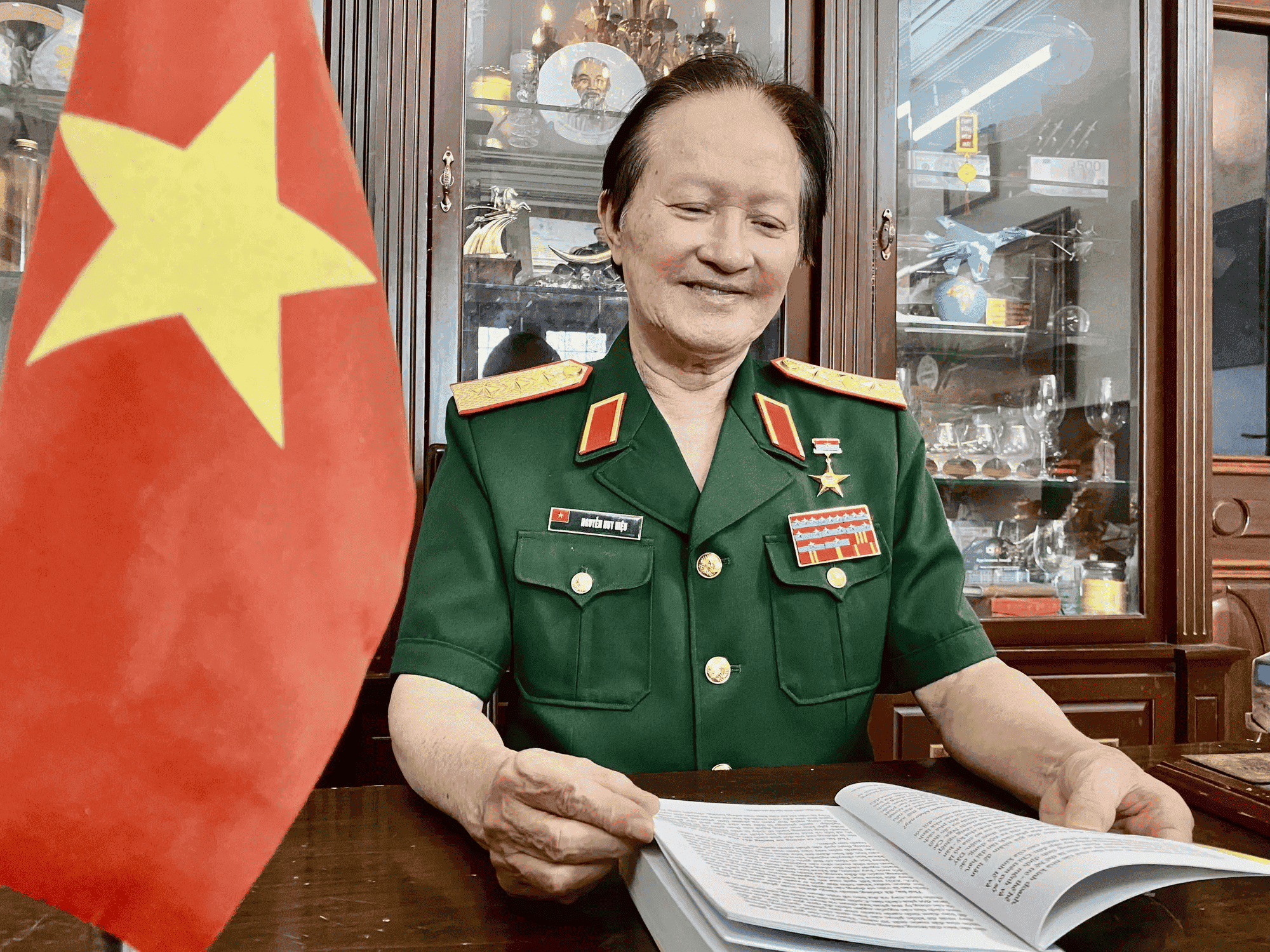 Thượng tướng, Viện sĩ, Anh hùng lực lượng vũ trang nhân dân Nguyễn Huy Hiệu (nguyên Ủy viên Trung ương Đảng, nguyên Thứ trưởng Quốc phòng) xem lại những trang sách viết về ông Lê Huy Ngọ - người đi trong bão lũ.