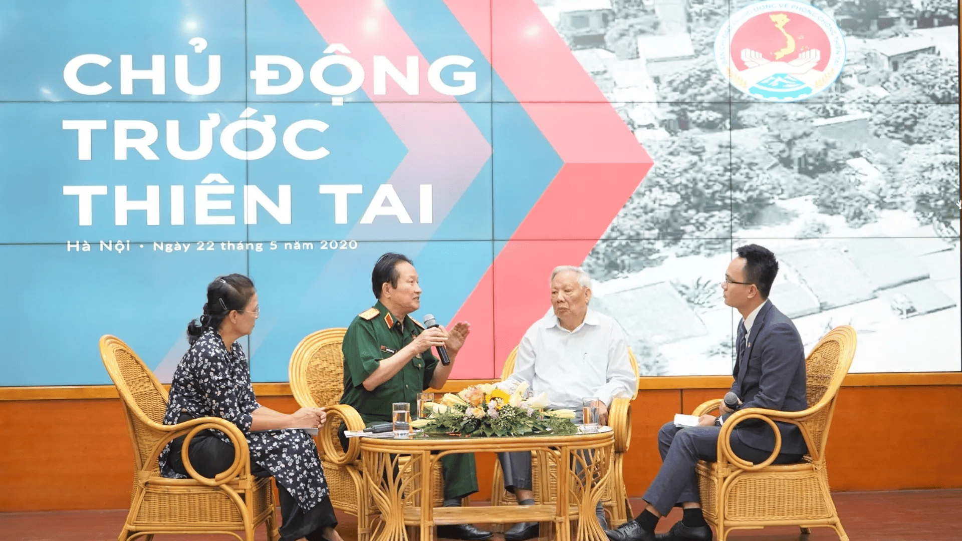 Thượng tướng, Viện sĩ Nguyễn Huy Hiệu và ông Lê Huy Ngọ tại buổi tọa đàm với chủ đề “Chủ động trước thiên tai” trong khuôn khổ Lễ kỷ niệm 74 năm Ngày Phòng chống thiên tai Việt Nam (22-5-1946 – 22-5-2020. Ảnh tư liệu.