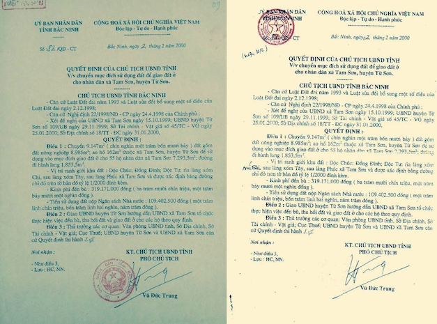 Từ quyết định của Chủ tịch UBND tỉnh Bắc Ninh đã bị tẩy xóa, ông Dự ráo riết đề nghị Chủ tịch UBND thị xã Từ Sơn thu hồi 420m2 đất của 3 hộ nghèo ở xã Tam Sơn.