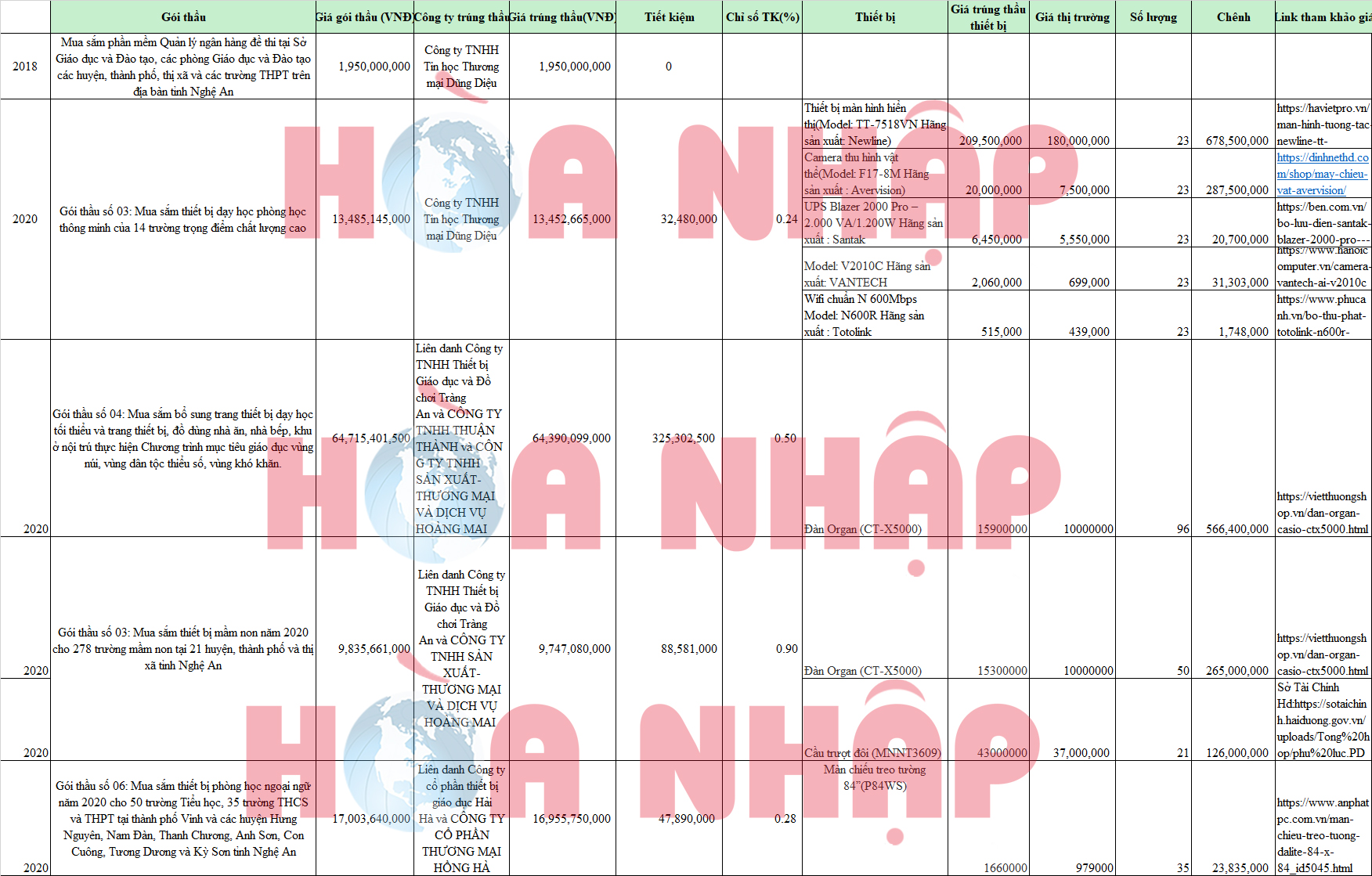 Hay ở một số gói thầu khác như "Gói thầu số 04: Mua sắm bổ sung trang thiết bị dạy học tối thiểu và trang thiết bị, đồ dùng nhà ăn, nhà bếp, khu ở nội trú thực hiện Chương trình mục tiêu giáo dục vùng núi, vùng dân tộc thiểu số, vùng khó khăn." và "Gói thầu số 03: Mua sắm thiết bị mầm non năm 2020 cho 278 trường mầm non tại 21 huyện, thành phố và thị xã tỉnh Nghệ An" trong năm 2020 cả 2 gói thầu này Liên danh Công ty TNHH Thiết bị Giáo dục và Đồ chơi Tràng An và Công Ty TNHH Sản Xuất Thương Mại Và Dịch Vụ Hoàng Mai trúng thầu với chỉ số tiết kiệm cực thấp và một số mặt hàng còn cao hơn giá thị trường và các nhà thầu khác. Điển hình là thiết bị Đàn Organ (CT-X5000) với số lượng cả 2 gói thầu lên đến 146 thiết bị đã khiến tổng chênh lệnh lên tới 831.400.000 VNĐ. Hay với thiết bị cầu trượt đôi thì trong gói thầu số 03: Mua sắm thiết bị mầm non năm 2020 cho 278 trường mầm non tại 21 huyện, thành phố và thị xã tỉnh Nghệ An mặc dù yêu cầu kỹ thuật có vẻ như thấp hơn ( kích thước : D3300 x R2800 x C3000 mm ) nhưng giá lại cao hơn so với thiết bị mà sở tài chính Hải Dương đặt mua ( kích thước D4000 x R2800 x C3300 mm ), mức chênh lên đến 6.000.000 VNĐ và tổng chênh lên đến 126.000.000 VNĐ.