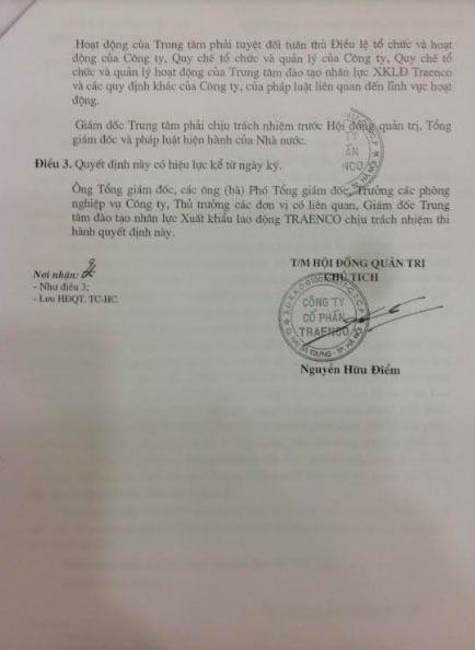 Quyết định thành lập Trung tâm Đào tạo Nhân lực XKLĐ của Traenco có nêu chủ trương thành lập Trung tâm này tại biên bản số 33/BB-HĐQT ngày 16/8/2017