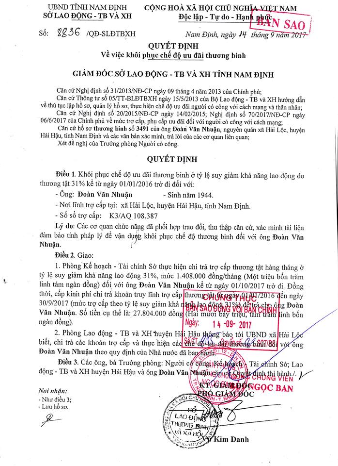 Hay như, chuyện thương binh Đoàn Văn Nhuận, bị đình chỉ thực hiện chế độ ưu đãi TB và thu hồi trợ cấp thương tật theo Quyết định số 88 ngày 1/1/2016 của Sở LĐTB-XH tỉnh Nam Định. Thiếu tướng Hoàng Kiền, Anh Hùng LLVTND, nguyên Trung đoàn trưởng Trung đoàn Công binh 83 thuật lại: “Cựu chiến binh, TB Đoàn Văn Nhuận, quê xã Hải Lộc, huyện Hải Hậu (Nam Định) là y sỹ của Trung đoàn 83, bị thương ở chiến trường Trường Sơn năm 1971, hiện nay anh nghỉ ở quê xã Hải Lộc huyện Hải Hậu tỉnh Nam Định. Vừa qua Thanh tra của Bộ LĐTB-XH đã thanh tra và kết luận hồ sơ thương binh của anh Nhuận là giả mạo, quyết định thu lại sổ và truy thu số tiền đã nhận từ trước đến nay… Chúng tôi ngồi xem lại hồ sơ thấy anh Nhuận làm đúng. Giấy chứng nhận bị thương đã ép plastic, hồ sơ nộp lên xã, huyện đúng như vậy, từ cấp tỉnh mới đem bút sửa bên ngoài giấy ép plastic ấy. Thanh tra Bộ LĐTB-XH kết luận ngay là hồ sơ giả”.