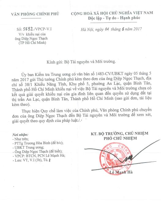 Thực hiện quy chế làm việc của Chính phủ, ngày 1/6/2017, Văn phòng Chính phủ đã ký văn bản số 5692/VPCP-V.I chuyển đơn của ông Diệp Ngọc Thạch đến Bộ Tài nguyên và Môi trường (sau đây gọi tắt là Bộ TNMT) để xem xét, giải quyết theo quy định của pháp luật.