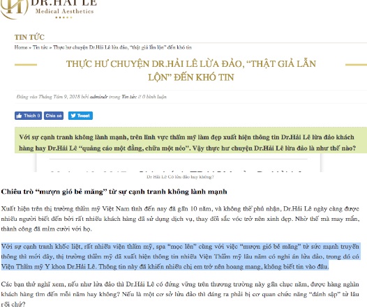 Quan tìm hiểu được biết, cách đây không lâu, Dr Hải Lê cũng đăng tải một bài viết để thanh minh “thực hư chuyện Dr Hải Lê lừa đảo, thật giả lẫn lộn đến khó tin”, trong đó có đoạn: “Với sự cạnh tranh khốc liệt, rất nhiều viện thẩm mỹ, spa “mọc lên” cùng với việc