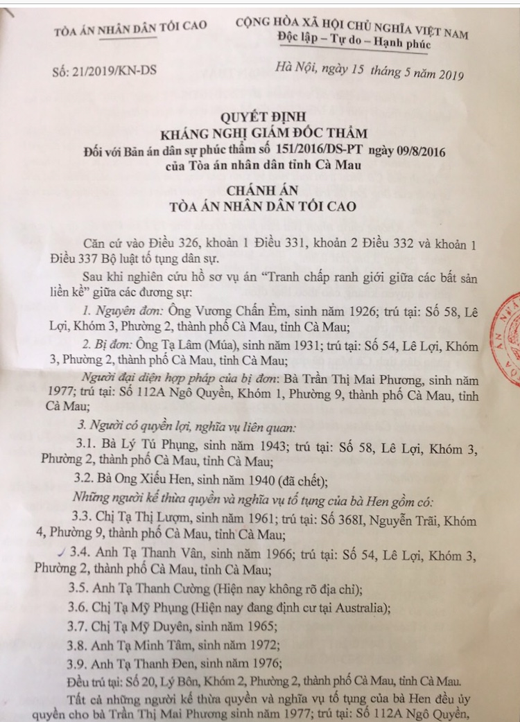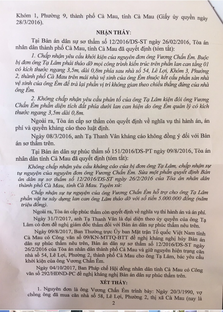 Tại bản án dân sự phúc thẩm số 151/2016/DS-PT ngày 9/8/2016 của TAND tỉnh Cà Mau quyết định: Không chấp nhận yêu cầu kháng cáo của bị đơn ông Tạ Lâm, chấp nhận sự tự nguyện của nguyên đơn ông Vương Chấn Ẻm. Sửa 1 phần quyết định bản án sơ thẩm số 12/2016/DS-ST ngày 26/2/2016 của TAND thành phố (TP) Cà Mau tuyên xử: Chấp nhận sự tự nguyện của ông Vương Chấn Ẻm, hỗ trợ cho ông Tạ Lâm, phần vật tư xây dựng lan can với số tiền 5 triệu đồng. Không đồng ý với bản án trên, anh Tạ Thanh Vân- là đại diện theo ủy quyền của ông Tạ Lâm, có đơn đề nghị giám đốc thẩm đối với bản án dân sự phúc thẩm của TAND tỉnh Cà Mau. Tiếp đó, ngày 9/8/2017, Ban Thường trực Ủy ban Mặt trận Tổ quốc tỉnh Cà Mau có Công văn số 09/KN-MTTQ-BTT, đề nghị kháng nghị hủy bản án DSPT của TAND tỉnh Cà Mau và bản án số 12/2016/DS-ST ngày 26/2/2016 của TAND TP.Cà Mau; giữ nguyên hiện trạng căn nhà số 54 Lê Lợi, phường 2 TP. Cà Mau cho ông Tạ Lâm, bác yêu cầu khởi kiện của ông Vương Chấn Ẻm. Ngày 4/10/2018, Ban Pháp chế HĐND tỉnh Cà Mau có Công văn số 292/HĐND-PC đề nghị kháng nghị bản án số 151/2016/DS-PT của TAND tỉnh Cà Mau.
