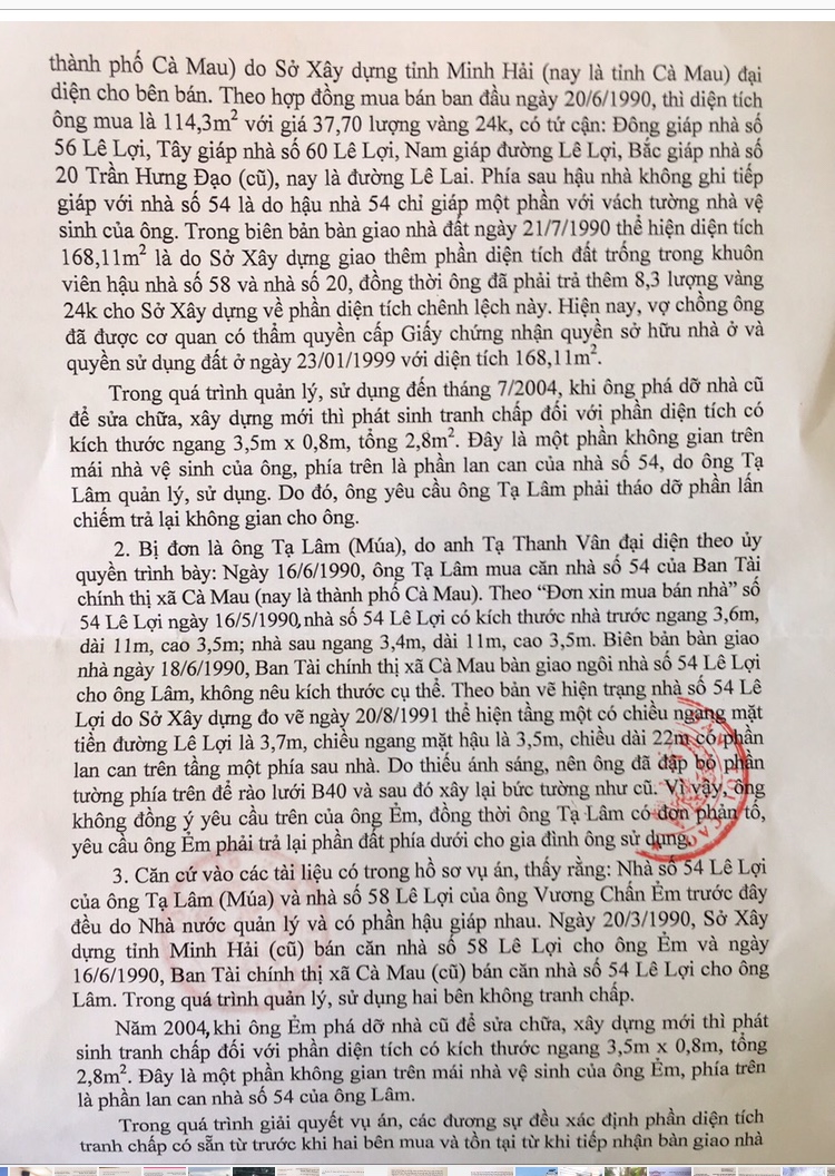 Bị đơn ông Tạ Lâm (Múa) do anh Tạ Thanh Vân đại diện theo ủy quyền trình bày: Ngày 16/6/1990, ông Tạ Lâm mua căn nhà số 54 Lê Lợi của Ban Tài chính thị xã Cà Mau (nay là TP.Cà Mau) theo đơn xin mua bán nhà số 54 Lê Lợi ngày 16/5/1990, nhà số 54 Lê Lợi có kích thước nhà trước ngang 3,6m, dài 11m, cao 3,5m; nhà sau ngang 3,4m, dài 11m, cao 3,5m. Biên bản bàn giao nhà ngày 18/6/1990, Ban Tài chính thị xã Cà Mau bàn giao căn nhà 54 Lê Lợi cho ông Tạ Lâm, không nêu kích thước cụ thể. Theo bản vẽ hiện trạng, nhà số 54 Lê Lợi do Sở Xây dựng đo vẽ ngày 20/8/1991 thể hiện tầng 1 có chiều ngang mặt tiền đường Lê Lợi là 3,7m, chiều ngang mặt hậu là 3,5m, chiều dài 22m, có phần lan can trên tầng 1 phía sau nhà. Do thiếu ánh sáng nên ông Tạ Lâm đã đập bỏ phần tường phía trên để rào lưới B40 và sau đó xây lại bức tường như cũ. Vì vậy, ông không đồng ý yêu cầu của ông Ẻm đồng thời ông Tạ Lâm có đơn phản tố, yêu cầu ông Ẻm phải trả lại phần đất phía dưới cho gia đình ông sử dụng. Dư luận người dân địa phương bức xúc cho biết, chính cách làm việc không minh bạch, có khuất tất của Sở Xây dựng, đã dẫn đến tranh chấp giữa các bên. Đây là nội dung cần được làm rõ và công khai cho người dân được biết.