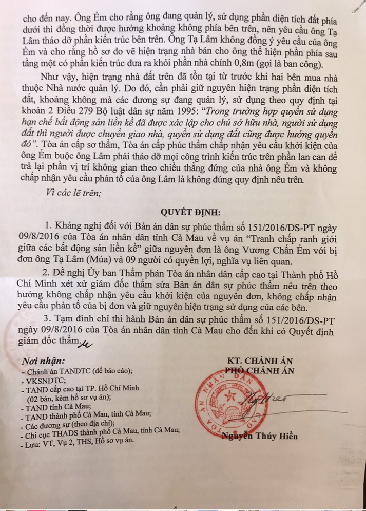 Vì vậy, TANDTC quyết định Kháng nghị đối với bản án dân sự phúc thẩm số 151/206/DS-PT ngày 9/8/2016 của TAND tỉnh Cà Mau, về vụ án tranh chấp ranh giới giữa các bất động sản liền kề, giữa nguyên đơn là ông Vương Chấn Ẻm với bị đơn là ông Tạ Lâm (Múa) và 9 người có quyền lợi, nghĩa vụ liên quan. Đề nghị TAND Cấp cao tại TP.Hồ Chí Minh, xét xử giám đốc thẩm sửa bản án dân sự phúc thẩm nêu trên theo hướng không chấp nhận yêu cầu khởi kiện của nguyên đơn, không chấp nhận yêu cầu phản tố của bị đơn và giữ nguyên hiện trạng sử dụng của các bên.