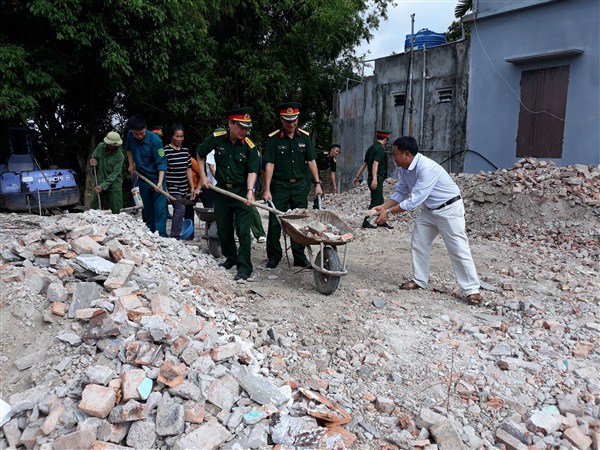 Các đại biểu cùng gia đình chung tay dọn dẹp tạo mặt bằng để khởi công nhà.