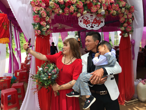 Cô dâu Kiều Duyên và chú rể Quốc Hoàng chụp ảnh selfie cùng con trai Củ Mì trong ngày cưới - - Ảnh: MY LĂNG